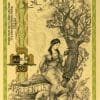She is gazing into a mirror held in one hand, symbolizing perspective, learning from experience and using hindsight. On her other wrist is a copper bracelet in the form of a snake, representing the struggle of trials as well as using wisdom to make choices. At her feet is a chipmunk, suggesting the preparations that they make each year ahead of winter as a symbol of prudence through preparedness. The wolf is next to her, calling out to all who listen to use prudence, and how the use of gold is a keystone to an economy, just how the wolves of Yellowstone are keystone predators, and the removal of either has shown a deterioration of their surroundings. The footing: “Deal Prudently” can also be found in the bottom right corner of the artwork. Finally, in the background Bryce Canyon National Park’s Natural Bridge formation is shown with Canada geese flying in formation.