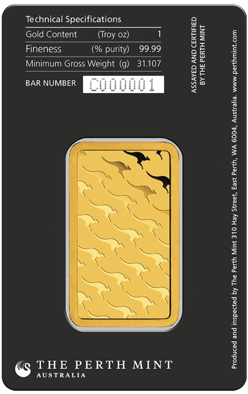 Produced in eight sizes, gold bullion minted bars portray a struck version of The Perth Mint’s LBMA registered mark on the front and kangaroo-shaped motifs on the back. Each minted bar comes housed in tamper-evident packaging which shows the word VOID around the edge of the blister if the card has been prized opened. The card is charcoal-coloured with a dark, watermark-like image of the Mint’s stylised swan logo.