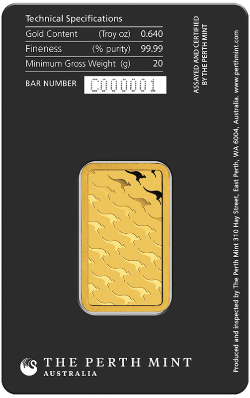 Produced in eight sizes, gold bullion minted bars portray a struck version of The Perth Mint’s LBMA registered mark on the front and kangaroo-shaped motifs on the back. Each minted bar comes housed in tamper-evident packaging which shows the word VOID around the edge of the blister if the card has been prized opened. The card is charcoal-coloured with a dark, watermark-like image of the Mint’s stylised swan logo.